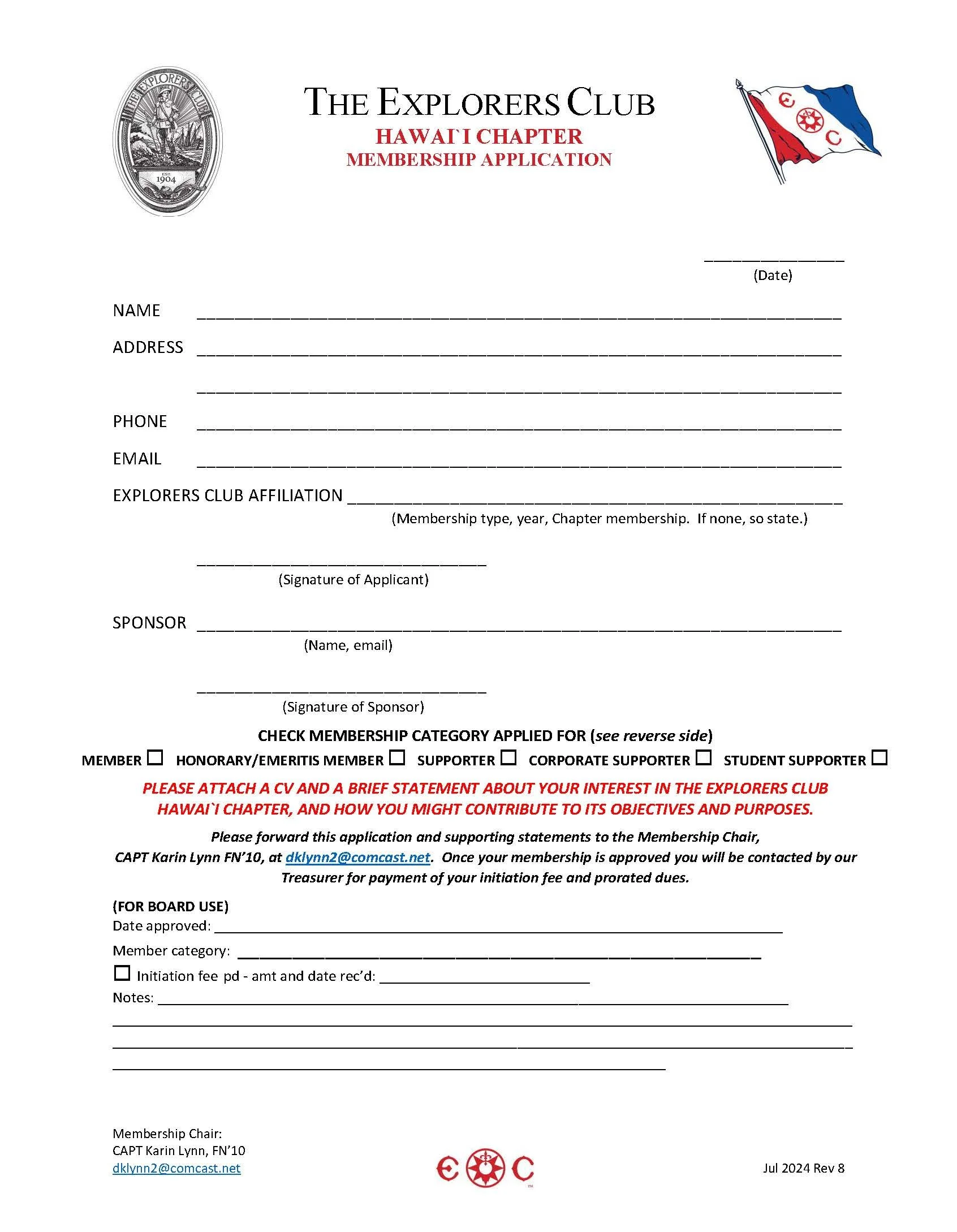 JOIN THE EXPLORERS CLUB HAWAI‘I CHAPTER Please contact us if you are interested in becoming a member or would like to know more about the Explorers Club Hawai‘i Chapter. Membership@explorersclubhawaii.org Click to view/Print our ECH Dues Policy (left)ECH Membership Application (right)